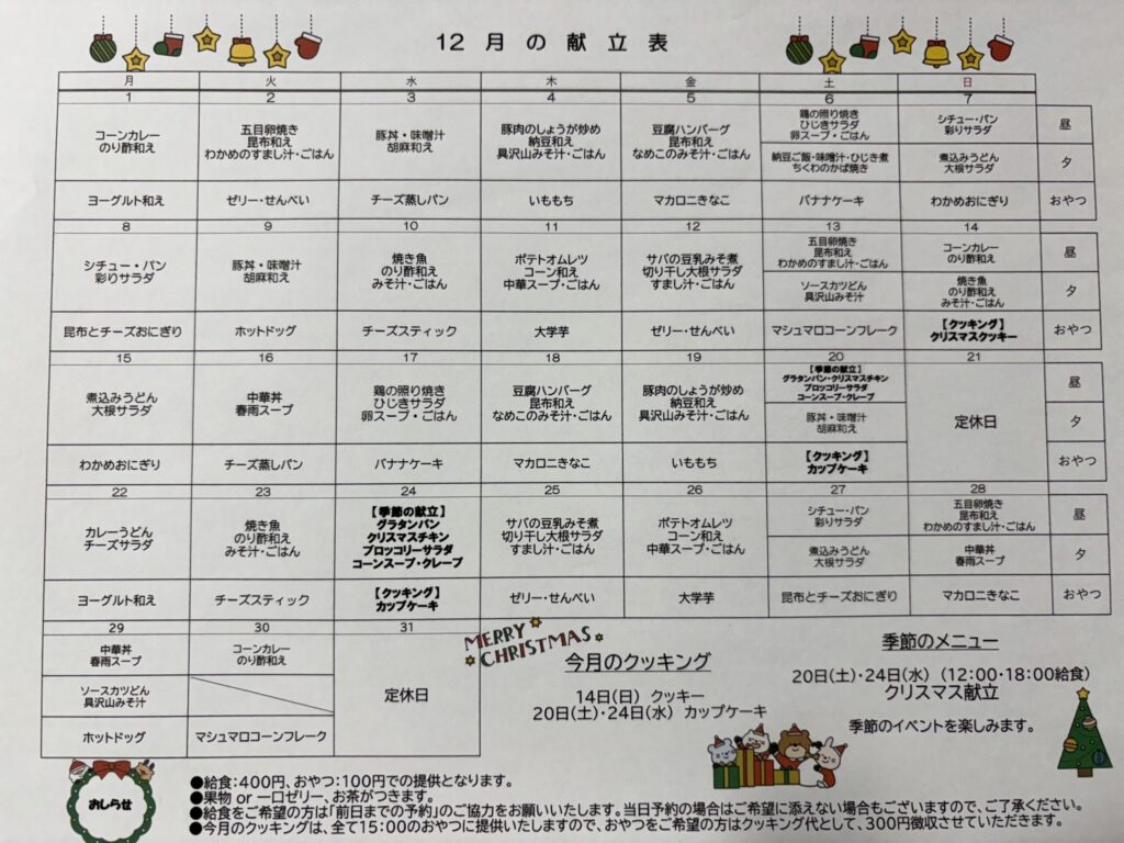 12月の献立 2025 12/04 お知らせ 2025年12月1日2025年12月4日 お知らせ よかったらシェアしてね! URLをコピーしました! URLをコピーしました! 12月の予定 12月保健だより 関連記事 【重要】価格改定及び定休日変更のお知らせ(2026年1月1日より) 2025年12月4日 12月保健だより 2025年12月1日 12月の予定 2025年12月1日 RSウイルス感染症発生のお知らせ 2025年11月21日 年末年始のお知らせ 2025年11月18日 11月献立 2025年10月31日 11月予定 2025年10月31日 10月ほけんだより 2025年10月1日
